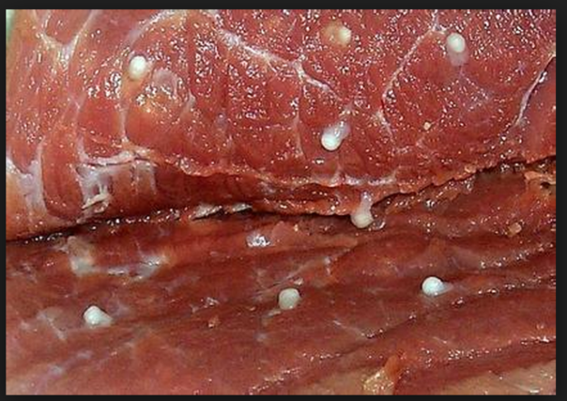 • สำหรับวงจรชีวิตเกิดจากหมูหรือวัวนั้นกินอาหารที่มีการปนเปื้อนของไข่พยาธิเข้าไป หลังจากนั้นพยาธิก็จะไปฝังตัวบริเวณกล้ามเนื้อต่างๆเพื่อเจริญเติบโต ทำให้บางครั้งถึงเห็นลักษณะเม็ดขาวๆคล้ายเม็ดสาคูนั่นเอง